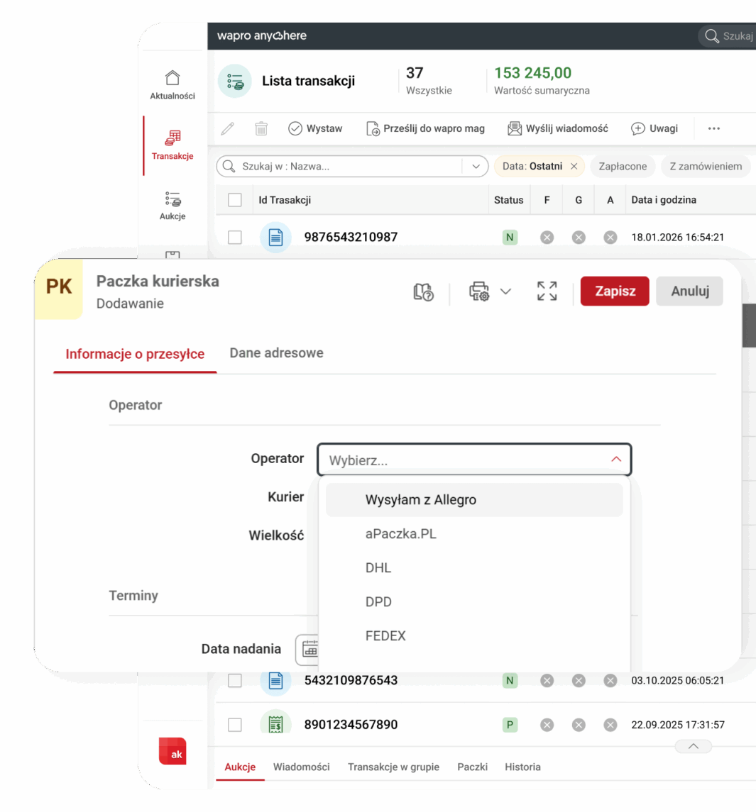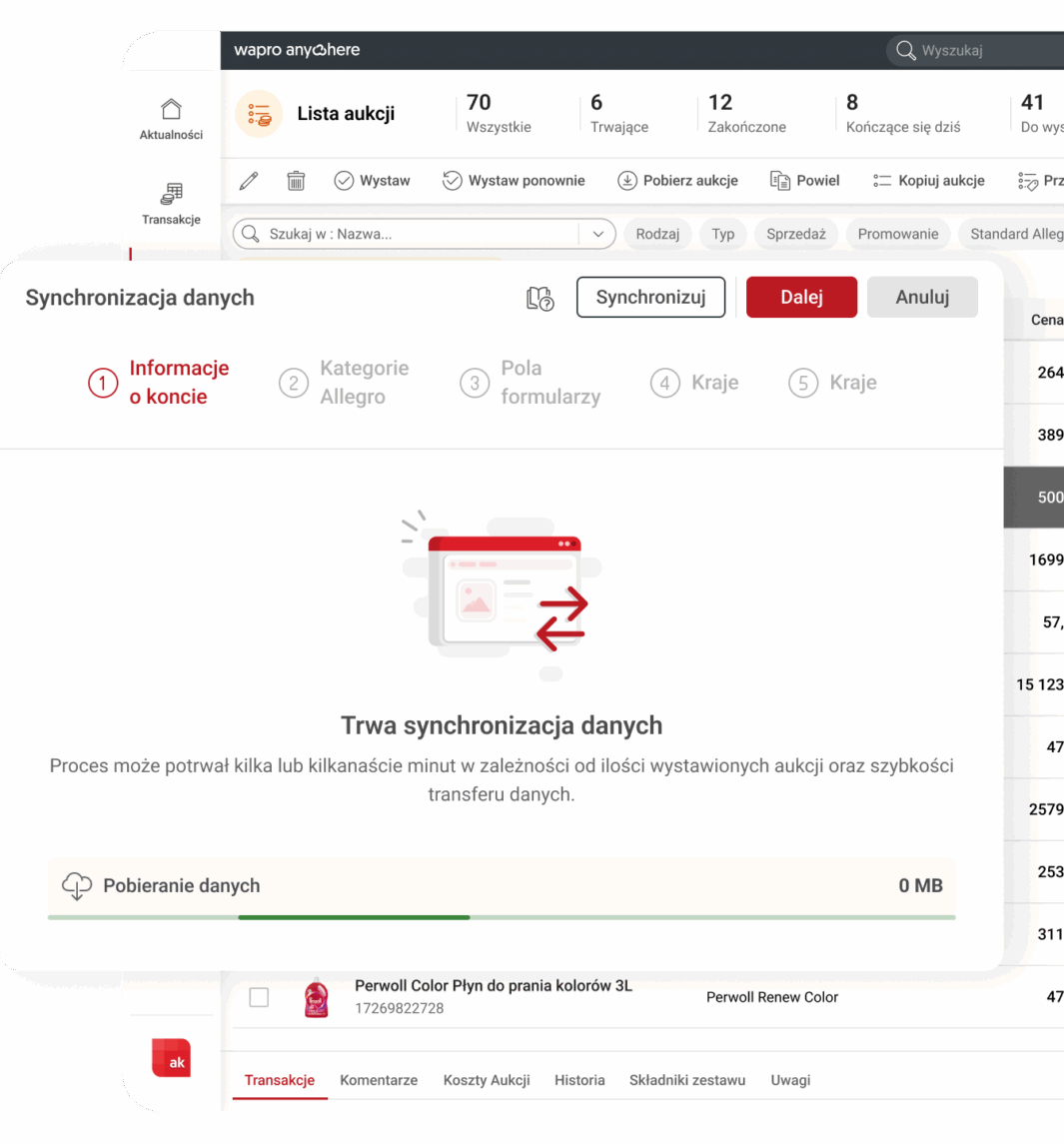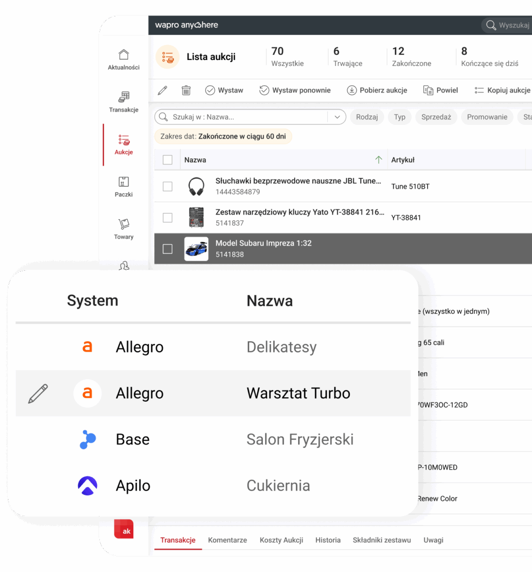 Wystawiaj oferty szybciej i wygodniej – bezpośrednio z Wapro Sprzedaż i Magazyn. Przeglądaj, zarządzaj i aktualizuj aukcje w jednym miejscu, bez zbędnych kliknięć.