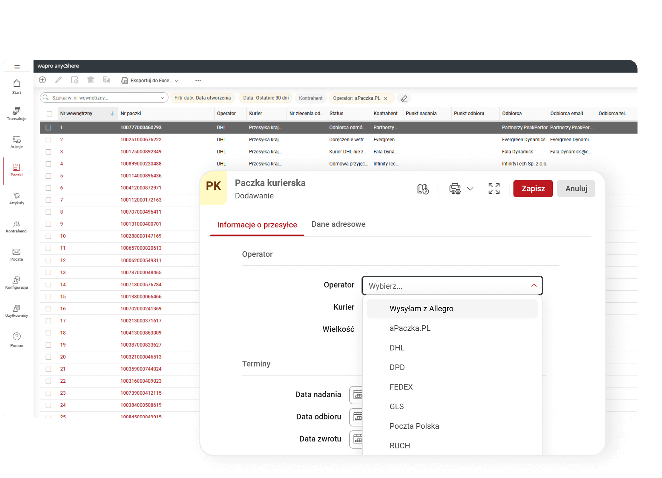Wapro Aukcje Internetowe to moduł umożliwiający wygodne zarządzanie sprzedażą na popularnych platformach aukcyjnych, takich jak: Allegro, Base (dawniej BaseLinker) i Apilo, bezpośrednio z poziomu systemu Wapro Mag. Umożliwia automatyczną synchronizację ofert, cen, stanów magazynowych i zamówień, co znacząco oszczędza czas i minimalizuje ryzyko błędów. Dzięki Wapro Aukcje, obsługa portali aukcyjnych jest prostsza, szybsza i bardziej efektywna.