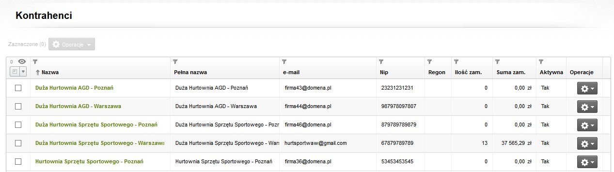 KontrahenciLista kontrahentów(dostęp w panelu administracyjnym: Menu [ Sklep ] → Sprzedaż [ Kontrahenci ])Kontrahenci są integrowani z systemem ERP WAPRO Mag. W zakładce tej widzimy listę kontrahentów (płatników) oraz ich podstawowych danych takich jak: nazwa, nazwa pełna, adres e-mail, NIP, Regon, ilość zamówień, suma zamówień, czy aktywny. Listę możemy filtrować i sortować w dowolny sposób. Funkcjonalności te są dostępne po najechaniu na nagłówek tabelki.