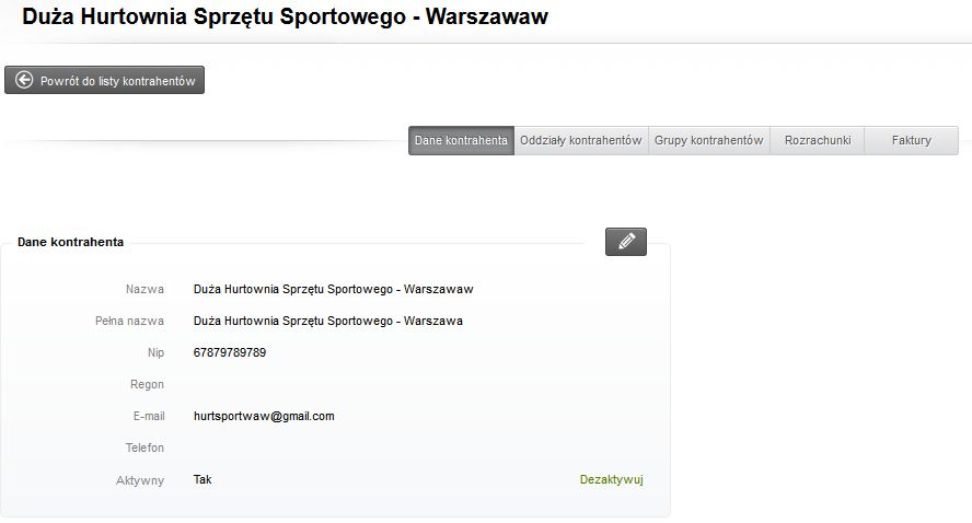 Operacje grupowePo zaznaczeniu kontrahenta/ów checkbox-em otrzymujemy możliwość grupowej operacji Aktywuj/dezaktywuj. (Operacja ta jest także dostępna przy każdym kontrahencie. Karta kontrahenta(dostęp w panelu administracyjnym: Menu [ Sklep ] → Sprzedaż [ Kontrahenci ] → wybranie na liście kontrahentów tego, który nas interesuje i kliknięcie go)Na karcie Dane Kontrahenta, podane są podstawowe informacje takie jak: nazwa, pełna nazwa, nip, regon, e-mail, telefon i czy aktywny. Używając przycisku edycji, możemy zmienić podane wyżej dane.