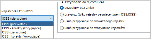Przypisanie (lub usunięcie przypisania) do wskazanego rejestru VAT nie jest równoznaczne z automatycznym przypisaniem (lub usunięciem przypisania) typu VAT z grupy OSS/IOSS do wybranych do modyfikacji zapisów. Operacji tej należy dokonywać ustawiając odpowiednio parametry w pierwszym panelu.