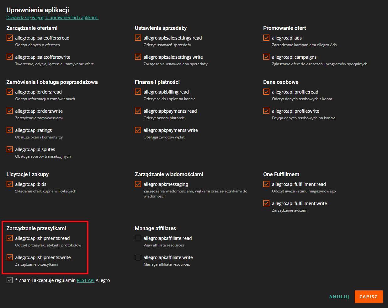 Po zdefiniowaniu adresu nadawcy użytkownik powinien upewnić się, że ma dostęp do API. W tym celu powinien przejść do widoku uprawnień aplikacji Allegro i sprawdzić, czy wszystkie pola w sekcji Zarządzanie przesyłkami są zaznaczone. Jeśli nie ma znaczników, należy je wstawić i kliknąć przycisk Zapisz.