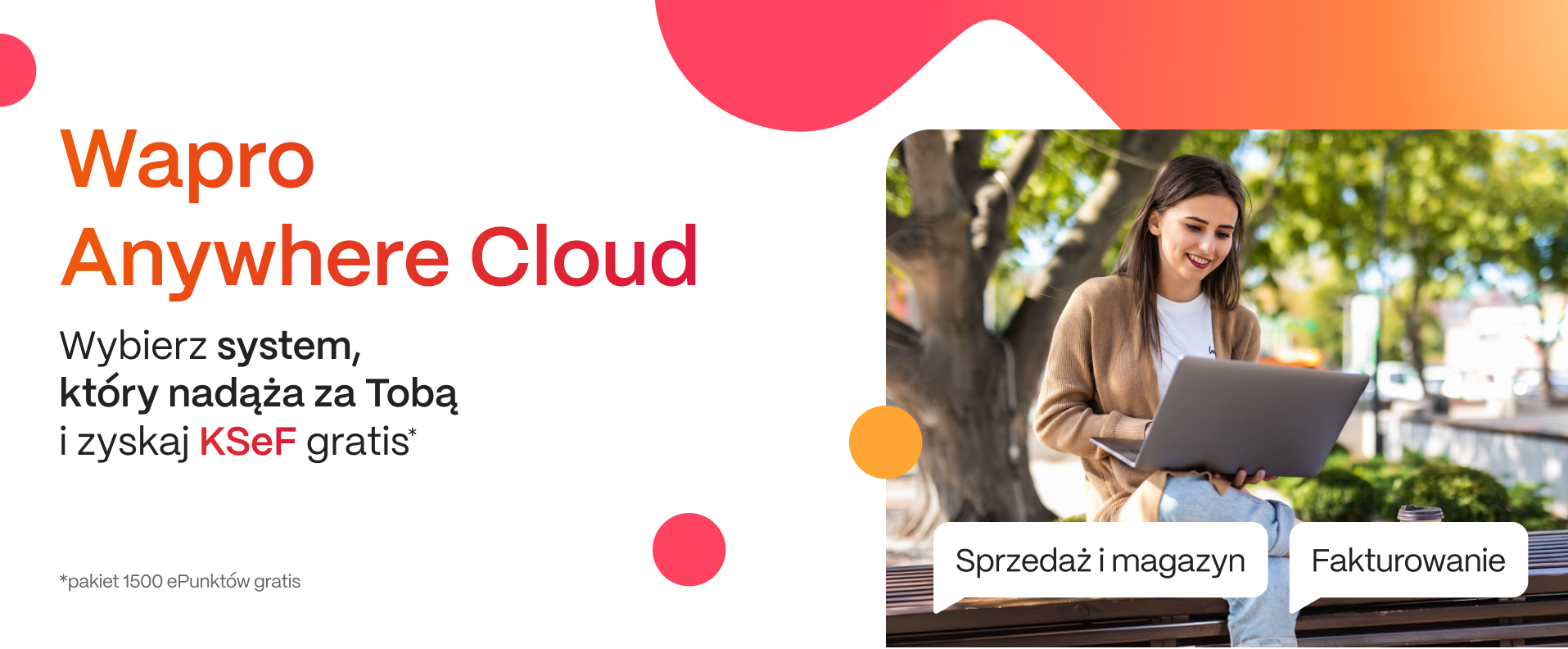 Wymóg rejestracji dokumentów w KSeF (Krajowy System e-Faktur) dotyczy już większości firm. Dlatego jeśli otwierasz nowy biznes lub chcesz zmienić swój dotychczasowy system – skorzystaj z naszego idealnego pakietu, który pomoże Ci dostosować organizację do wymogów prawnych. Wybierz nowoczesny system obsługujący fakturowanie i sprzedaż – Wapro Anywhere Cloud i zyskaj pakiet 1500 punktów Businesslink (które możesz przeznaczyć np. na komunikację z KSeF) gratis!