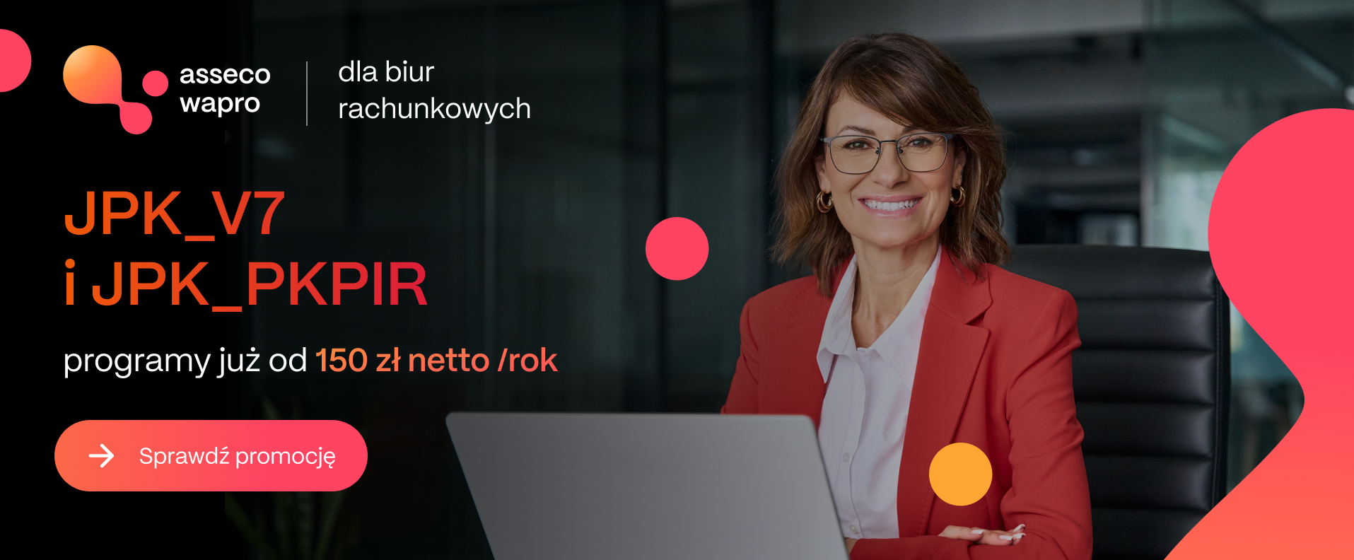 Pracuj na sprawdzonych systemach i nadążaj za zmianami w prawie. Teraz programy Wapro obsługujące JPK_V7 oraz JPK_PKPIR w specjalnej promocji dla biur rachunkowych. Już od 150 zł netto za rok, a ponad to pakiet do komunikacji z KSeF za 1 zł – sprawdź szczegóły!