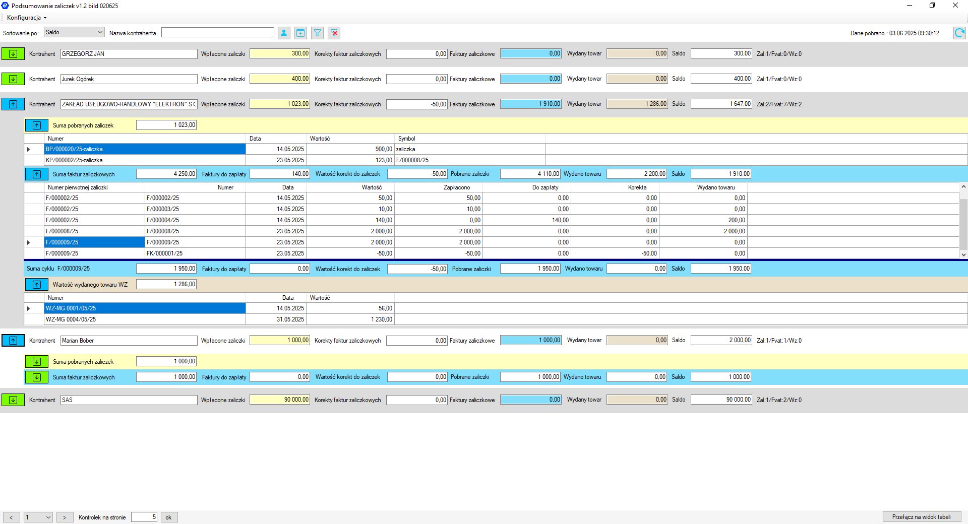 W głównym oknie prezentowane są salda dla wszystkich kontrahentów, u których odnotowano wpłatę zaliczki lub fakturę zaliczkową.