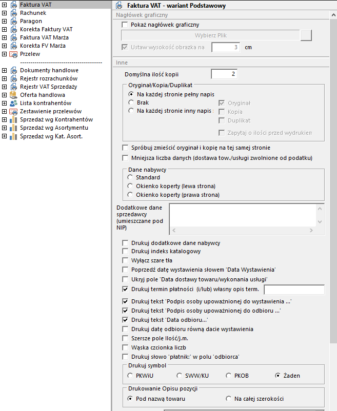 W lewej części okna znajduje się lista dostępnych wydruków podzielona na dwie sekcje. W górnej sekcji dostępna jest lista drukowanych dokumentów, a w dolnej lista dostępnych zestawień i raportów. Natomiast po prawej stronie znajduje się lista parametrów konfiguracyjnych wskazanego w lewej części raportu. Poniżej prezentujemy ustawienie formatki po wybraniu w lewej części Faktura VAT.