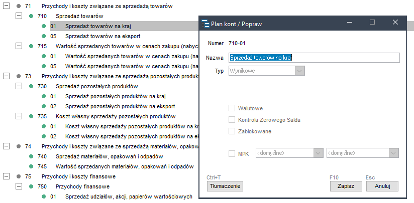 W planie kont nazwy zespołów kont, kategorii kont oraz nazwy kont księgowych można zapisać w wielu językach, a następnie wykorzystać je na wszystkich wydrukach opartych o plan kont, np. zestawienie obrotów i sald i innych. W tym celu w oknie planu kont należy wybrać gałąź (zespół, kategorię lub konto), która ma zostać przetłumaczona i kliknąć przycisk Popraw (klawisz F2).