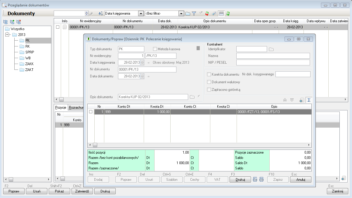 Po zaksięgowaniu noty, dane w oknie przeglądarki dla analizowanej transakcji uległy zmianie. Naliczona została korekta KUP w kwocie 1 000,00 zł, co spowodowało wyzerowanie pola Suma operacji.