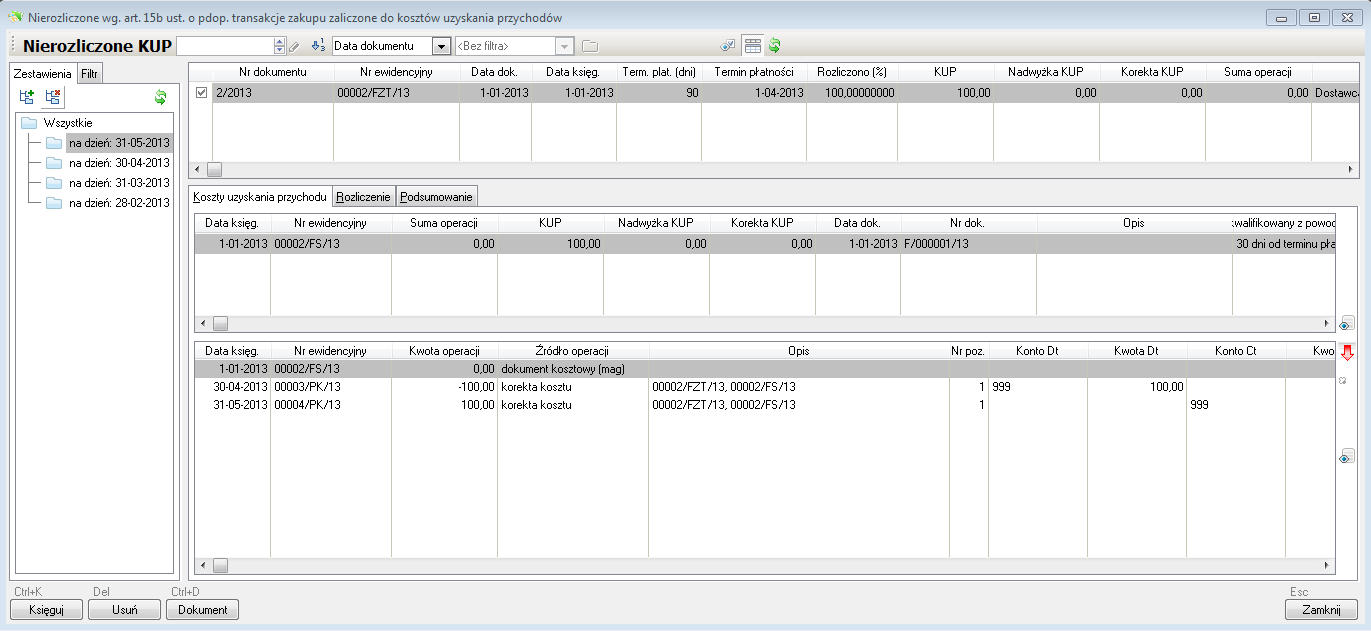- faktura zakupu numer: 2/2013 - miała termin płatności 90 dni, co oznacza, że w przypadku nierozliczenia tej transakcji, zgodnie z art. 15b ust. w kwietniu 2013, dla faktur z terminem płatności dłuższym niż 60 dni, po upływie 90 dni od daty uznania w kosztach uzyskania przychodów, w module powinna być wykazana nadwyżka kosztów uzyskania przychodów;
