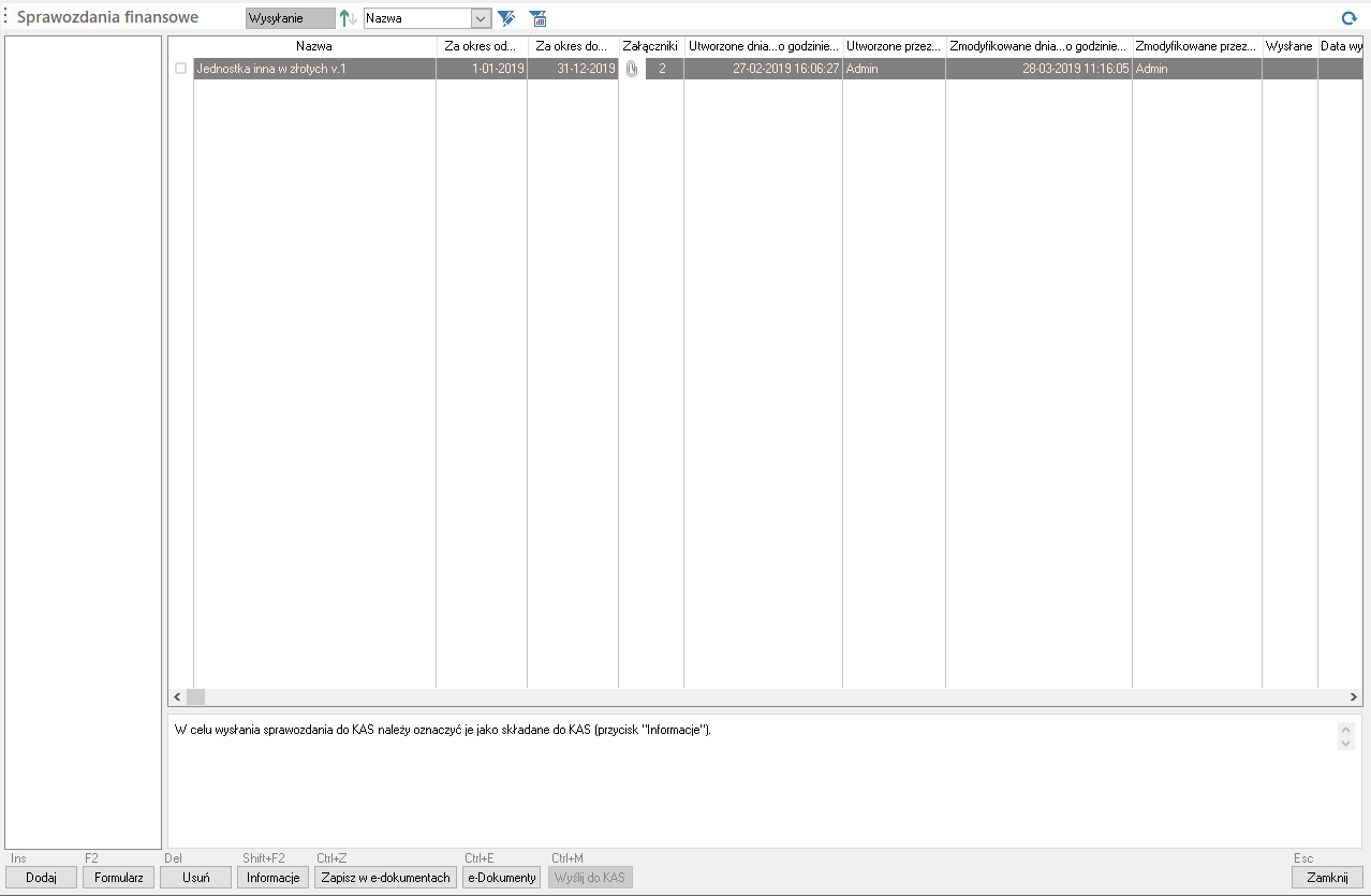 Po oznaczeniu w Informacjach wybranego na liście sprawozdania jako wysyłane do KAS, podobnie do poniższego przykładu: