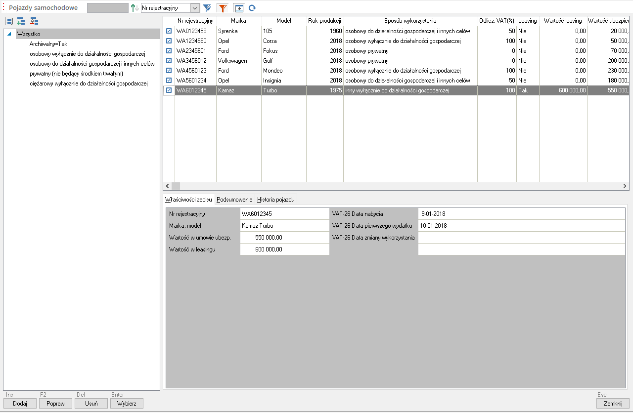 Powyższy przykład pokazuje, jak prosto, bez wykonywania samodzielnie żadnych obliczeń można rozksięgować koszty nawet na wiele różnego typu samochodów o różnym przeznaczeniu. Tak samo prosto, program rozliczy koszty związane z ratami leasingowymi / najmem / dzierżawą lub ubezpieczeniem samochodów. Wystarczy tylko wybrać odpowiedni rodzaj operacji na zakładce 5) KUP okna dodawania pozycji VAT.