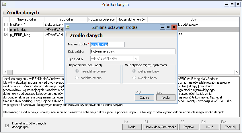 Źródło danych jest obiektem w programie, w którym zapisane są wszystkie wymagane informacje do przeprowadzenia poprawnego importu dokumentów takie jak informacja z jakiego programu pochodzą dane, czy z programu znajdującego się w tej samej bazie danych czy w rozłącznej, a jeżeli rozłącznej to w jakim formacie jest wyeksportowanych z nich pliku wymiany. Każde zdefiniowane w programie źródło danych ma swoją indywidualną nazwę, dobrze aby nazwa kojarzyła się z fizycznym źródłem to znaczy programem, z którego importowane są dane a w przypadku wielu źródeł zdefiniowanych dla Wapro Mag Sprzedaż i magazyn również z oddziałem firmy. Z każdym takim źródłem danych, jeżeli importowane będą dokumenty niezadekretowane, powiązany będzie odpowiedni zestaw definicji księgujących pozwalający na automatyczną dekretację importowanych przez to źródło danych dokumentów.