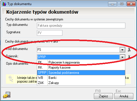 a następnie wybrać odpowiedni dziennik i typ dokumentu księgowego programu Wapro Fakir Finanse i księgowość: