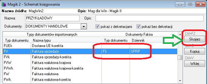 Zarówno w systemie WF–Mag, jak i w programie WF–FaKir dokumenty klasyfikowane są według określonych typów. Domyślne typy dokumentów w obu programach dostarczane razem z programami, ze względu na funkcje jakie w nich pełnią, różnią się a dodatkowo w systemie Wapro Fakir Finanse i księgowość użytkownicy mogą definiować i dodawać do programu własne typy dokumentów dlatego definiując nowy schemat księgujący należy jednoznacznie przypisać każdy typ dokumentu importowanego z programu WF–Mag do odpowiedniego typu dokumentu w programie Wapro Fakir Finanse i księgowość. Dodatkowo, ponieważ dokumenty w programie Wapro Fakir Finanse i księgowość muszą być przydzielane do dzienników, należy również wybrać dziennik, do którego dokumenty określonego typu mają zostać po zadekretowaniu przeniesione.