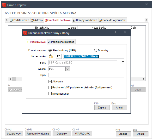 Dla każdej firmy można zdefiniować dowolną ilość rachunków bankowych, w jednym lub różnych bankach, w dowolnych walutach. Należy pamiętac o tym, że jeden rachunek powinien być zawsze zaznaczony jako rachunek podstawowy (domyślny). Rachunki firmy można również dezaktywować (odznaczając opcję Aktywny), co powoduje, że nie będą widoczne w żadnym miejscu systemu poza oknem definicji danych firmy.