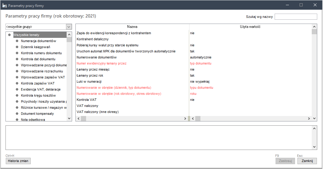Najważniejsze dla pracy systemu są parametry oznaczone kolorem czerwonym, ponieważ są to parametry związane ze sposobem numeracji dokumentów.