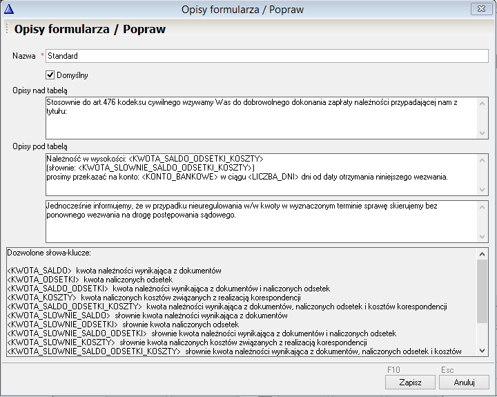 Jak widać na powyższym obrazie, tekst nadrukowywany na dokument może zawierać w treści indywidualne dla każdego dokumentu kwoty naliczone w dokumencie oraz wartości oraz dane zdefiniowane w parametrach wariantu wydruku. W definiowanej treści szablonu opisu w miejscu cytowanych kwot, numeru rachunku czy innych danych należy wstawić odpowiednie słowa kluczowe, które w czasie wydruku zostaną dynamicznie zamienione na odpowiednie kwoty czy inne informacje. Jak widać na powyższym obrazie dostępny zestaw słów kluczowych dla każdego dokumentu dostępny jest na formatce definiowania szablonu opisu.