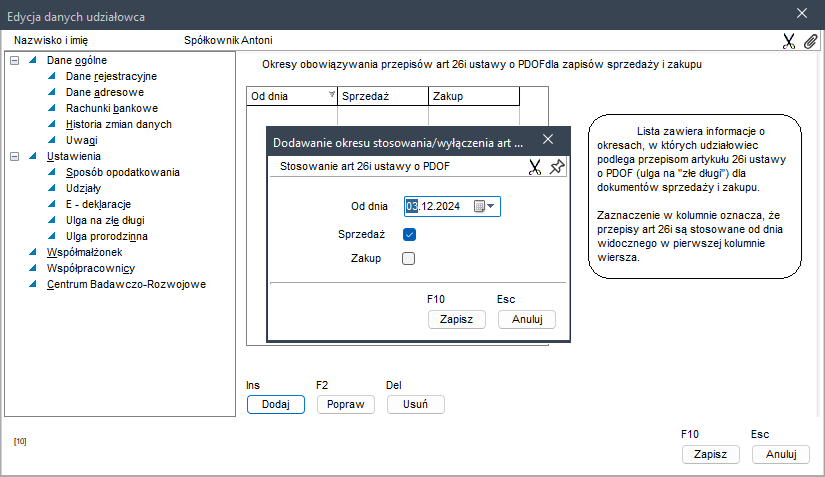 Na zakładce tej należy wprowadzić daty, od których w programie naliczane mają być podwyższenia/obniżenia podstawy opodatkowania dla udziałowca, wynikające z omawianych przepisów.