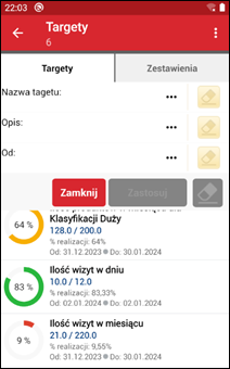 W menu Raportydostepne są dwa elementy: Targety oraz Zestawienia. Targety trafiają do urządzenia, przedstawiając bieżące wyniki działań handlowców. Wyliczenia wykonywane są na bieżąco podczas każdej replikacji.