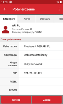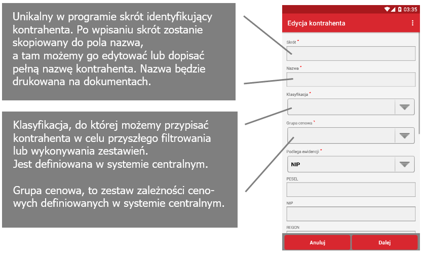 Dodanie nowego kontrahenta w aplikacji mobilnej skutkuje dopisaniem danych kontrahenta do systemu Wapro Mag. W przypadku powielenia istniejącego już kontrahenta, zostanie on dopisany z kolejnym numerem w nazwie skróconej nadanym przez system. W systemie centralnym istnieje możliwość scalenia kontrahentów.