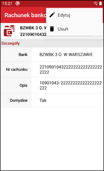 Aby zmodyfikować lub usunąć rachunek z listy należy wybrać odpowiednią opcję z listy menu trzech kropek.