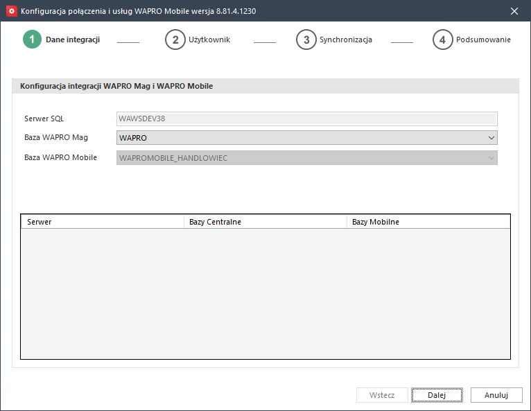 Kreator weryfikuje bazy na instancji serwera, w przypadku gdy istnieje tylko jedna baza Wapro Mag. Bazy Wapro Mobile Mag i Wapro Mobile są proponowane automatycznie.