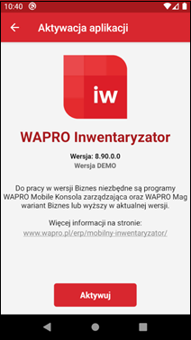Aplikacja może działać w trybie demo bezterminowo. Ograniczeniem jest brak możliwości replikacji danych z systemem Wapro Best. Z trybu tego należy korzystać wyłącznie w celu zapoznania się z funkcjonalnością.