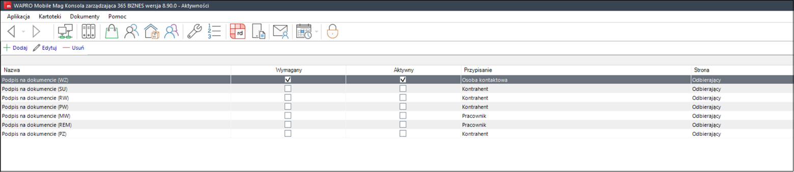 Aktywność podpisów w Wapro Mobile Mag włącza się przez edycję starego lub dodanie nowego przypisania do pracownika.