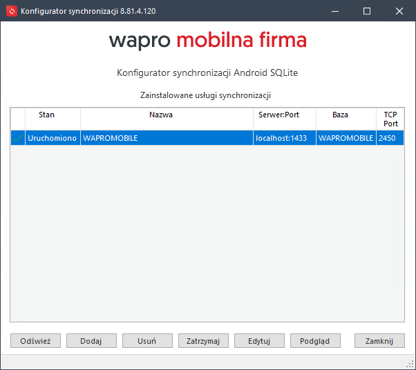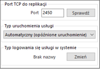 - Port TCP do replikacji - port wykorzystywany do połączenia urządzeń mobilnych. Istnieje możliwość zmiany portu na inny niż standardowy 2450. Przycisk