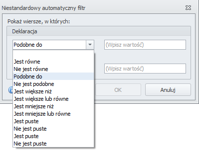 Po wybraniu z listy filtrowania opcji Niestandardowe, na ekranie wyświetli się formatka umożliwiająca zdefiniowanie kryterium. Poniżej zaprezentowana jest przykładowa formatka z rozwiniętą listą możliwych do wykorzystania operatorów relacji.