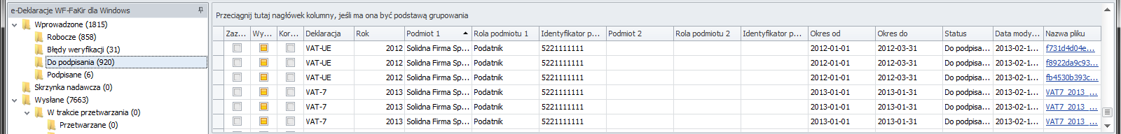 Po podpisaniu, deklaracje trafiają do folderu Podpisane uzyskując status Podpisane.