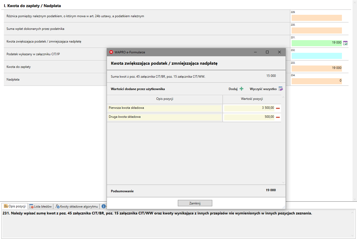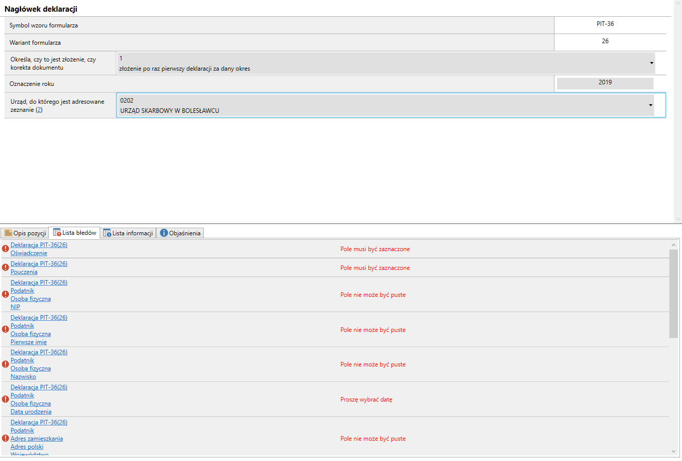 - Sekcja informacyjna - widoczna poniżej zawartości formularza, umożliwia wyświetlenie opisu pozycji, przegląd listy błędów i informacji, zapoznanie z kwotami składowymi algorytmu oraz z legendą kolorów.