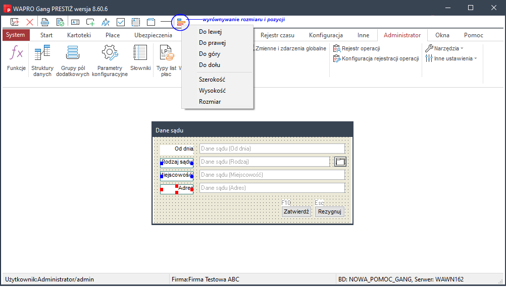 Uprość proces projektowania formularzy dzięki funkcji szybkiego wyrównywania w edytorze Wapro Gang. Ta intuicyjna opcja pozwala na precyzyjne dopasowanie rozmiaru i pozycji elementów, zapewniając spójność i profesjonalny wygląd Twoich formularzy.