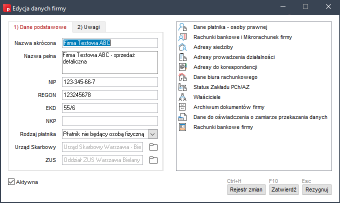 - Nazwa skrócona - identyfikuje firmę w obrębie programu i jest jednocześnie nazwą grupy domyślnej pracowników firmy,