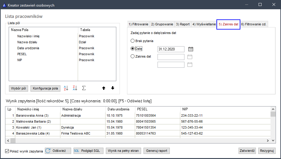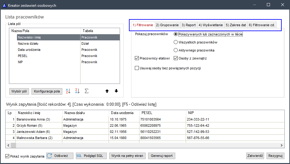 Aby wybrać pole, którego nie chcesz mieć na wydruku a które pomoże zawęzić dane, w konfiguracji pola ustaw jego szerokość na 0 (zero). Np. gdy chcesz wybrać tylko kobiety, ale nie chcesz mieć kolumny płeć na wydruku.