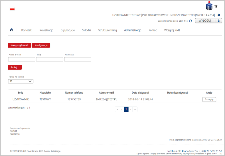 Kolejnym krokiem jest nadanie uprawnień nowo utworzonemu użytkownikowi. W tym celu należy przy wybranym użytkowniku w kolumnie Akcje kliknąć przycisk Szczegóły.