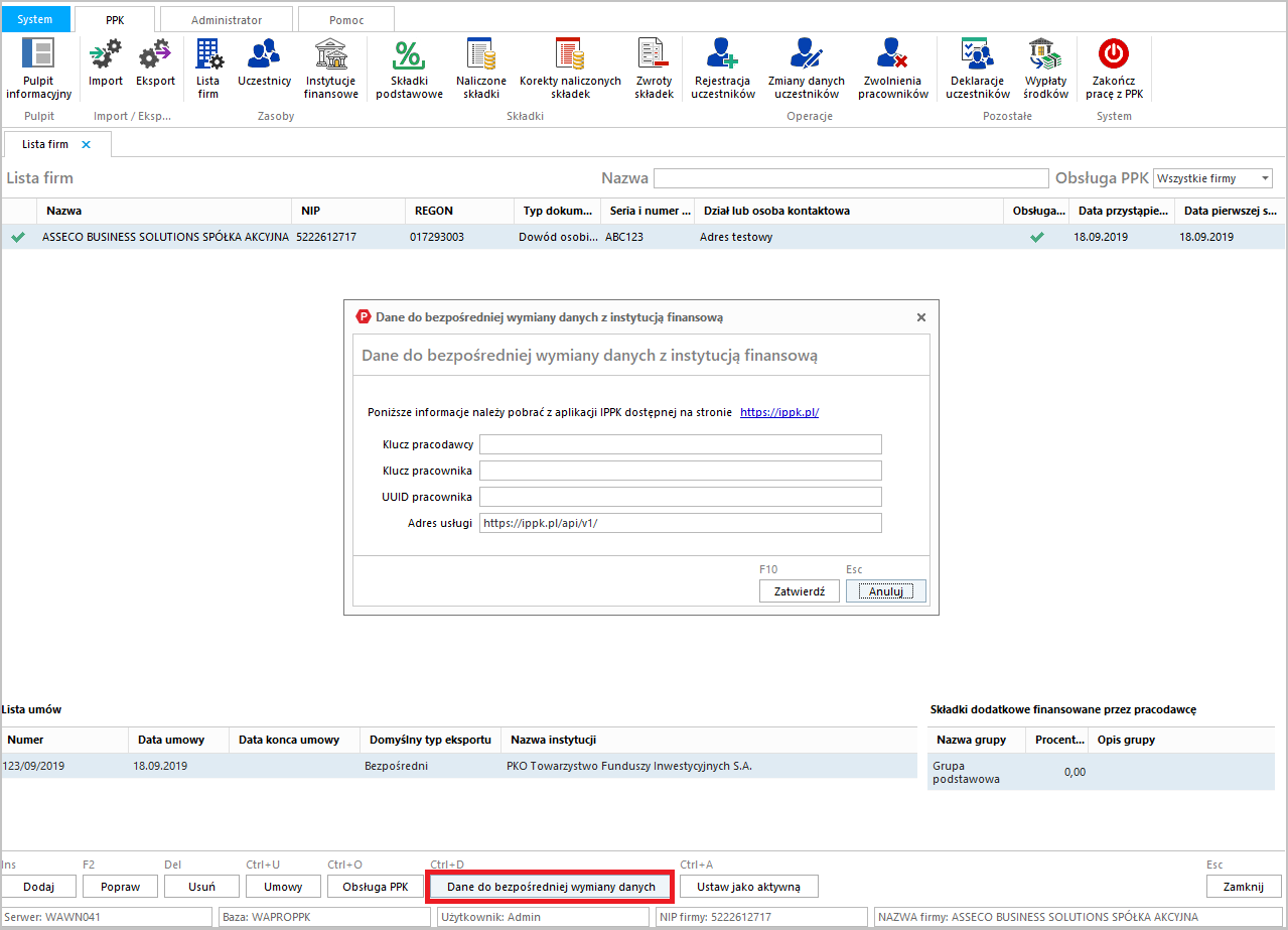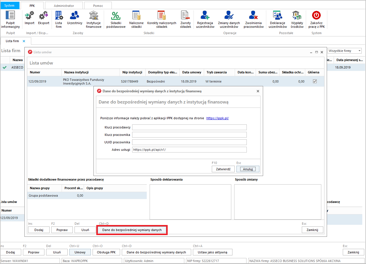 Kolejnym krokiem jest skonfigurowanie bezpośredniej wymiany danych z wybraną instytucją finansową. Do tego celu konieczne jest uzyskanie na stronie: ippk.pl następujących danych: