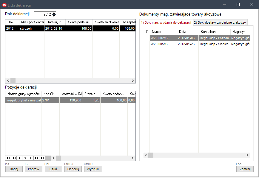 Aby wygenerować deklarację w Wapro Mag należy w oknie dokumentów akcyzowych kliknąć przycisk Deklaracje (klawisze Ctrl+E), a następnie zdefiniować nagłówek deklaracji za pomocą opcji Dodaj (klawisz Ins). W nagłówku należy określić datę wystawienia deklaracji, rok deklaracji i miesiąc. Po zapisaniu nagłówka system zaproponuje automatycznie wygenerowanie pozycji deklaracji dla wybranego miesiąca.