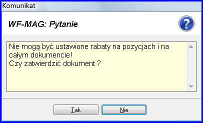 Gdy wybierzemy przycisk Nie program powróci do edycji formularza dokumentu handlowego (faktury). Dokument nie zostanie zatwierdzony, dopóki nie usuniemy rabatu na dokumencie lub na wszystkich pozycjach albo nie udzielimy twierdzącej odpowiedzi na powyższe pytanie.