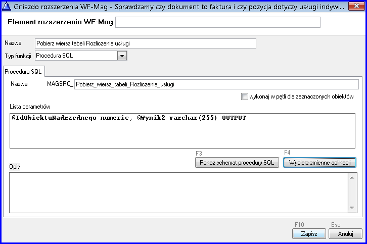 Teraz czas zdefiniować funkcję pobierającą dane do kalkulacji ceny usługi, czyli wywołać formularz tabeli dodatkowej Rozliczenie usługi. Z listy tabel wybieramy MAGGEN_Rozliczenie_uslugi. Program automatycznie oczekuje podania identyfikatora dokumentu handlowego stosownie do grupy tabel, gdzie zdefiniowaliśmy Rozliczenie usługi. Wybieramy z listy dostępnych zmiennych @IdObiektuNadrzednego. Pojawia się jednak problem, jaką wartość umieścić w polu Id wiersza w tabeli dla potrzeb formularza. W przypadku gdy dodajemy usługę, wystarczy podać wartość 0 (zero). Jednakże w trybie poprawiania pozycji powinniśmy podać taką wartość identyfikatora wiersza, jaka została nadana podczas dodawania pozycji. Identyfikator wiersza zawsze nadawany jest automatycznie po dodaniu wiersza do tabeli dodatkowej (jest to cecha konstrukcyjna tabel dodatkowych), wobec czego powinniśmy odczytać wartość identyfikatora wiersza i zapisać go w zmiennej (np. @Wynik2), którą podamy w polu Id wiersza w tabeli dla potrzeb formularza. Odczytu wartości identyfikatora i jego zapisu w zmiennej @Wynik2 najlepiej dokonać za pomocą procedury SQL.
