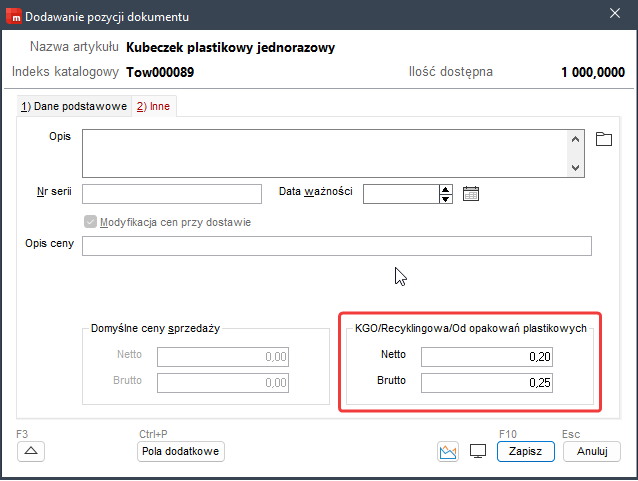 Po wyborze pozycji do dokumentu na zakładce Inne może zweryfikować lub zmodyfikować kwotę KGO.