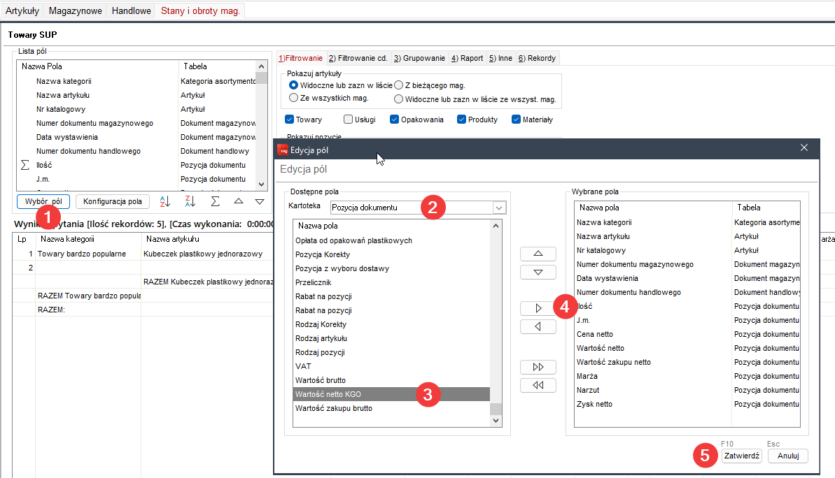 Masz do dyspozycji pełny kreator raportu, który umożliwia wybór pól, układu oraz docelowej formy raportu. W tym przypadku najważniejsze to dodanie nowego pola Wartość netto KGO poprzez kliknięcie opcji Wybór pól (dostępna w kartotece typu Pozycja dokumentu).