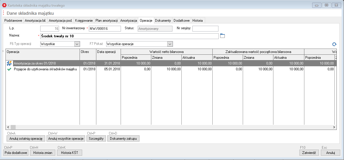 i zapisać je przyciskając przycisk ZATWIERDŹ. Tym razem okno zostanie zamknięte. W tym przypadku okno kartoteki środka trwałego jest zapisywane dwa razy: