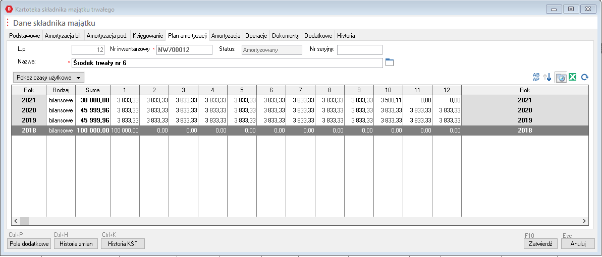 Po przyjęciu do użytkowania, naliczeniu planu amortyzacyjnego oraz naliczeniu amortyzacji za pierwszy miesiąc, w powyższym przykładzie - październik 2017, środek trwały zostanie całkowicie zamortyzowany.